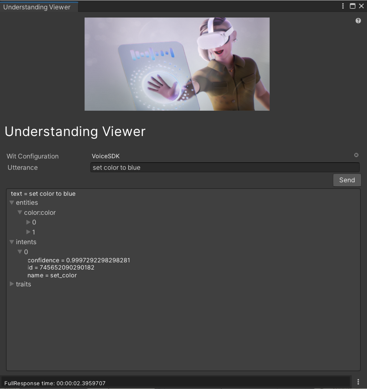 Now you need somehow tell Wit.AI what Intents are mapped to, also entities and traits (if you’ve any), well to do this you go to Unity > Oculus > Voice SDK > Understanding Viewer